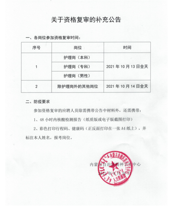 關(guān)于內(nèi)蒙古自治區(qū)第三醫(yī)院(精神衛(wèi)生中心)2021年度公開(kāi)招聘資格復(fù)審的補(bǔ)充公告